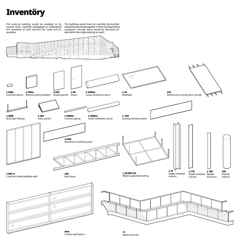 The recent availability of the IKEA site in Tottenham presents the London Borough of Enfield with an opportunity to tackle its housing needs in an area earmarked for growth and increased infrastructure. Our proposal catalogues the existing steel building, dismantles it and transforms it into a series of homes of varying sizes, from young-family homes with space to grow to smaller dwellings for young professionals, supporting a vibrant and diverse community in real need of places to live.