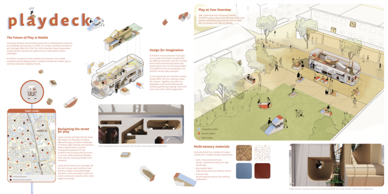 Increasing demand and shrinking space are challenges facing play in London. As London transitions to electric and hydrogen fleets by 2030, the 1000 redundant New Routemaster double-deckers becomes an opportunity to help address these challenges.
