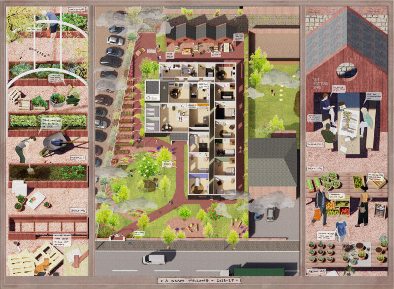 The theme of the third £25,000 annual Davidson Prize was 'Somewhere to Call Home'. The brief asked multi-disciplinary teams to communicate innovative design solutions for a home community where people who have experienced the trauma of homelessness and housing insecurity are given time to settle, recover and find their bearings.